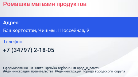 Ромашка, магазин продуктов по адресу Башкортостан, Чишмы, Шоссейная, 9 в дальнейшем Организация, размещена в следующих категориях: