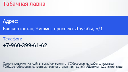 Табачная лавка по адресу Башкортостан, Чишмы, проспект Дружбы, 6/1 в дальнейшем Организация, размещена в следующих категориях: