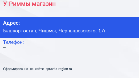 У Риммы, магазин по адресу Башкортостан, Чишмы, Чернышевского, 17г в дальнейшем Организация, размещена в следующих категориях: