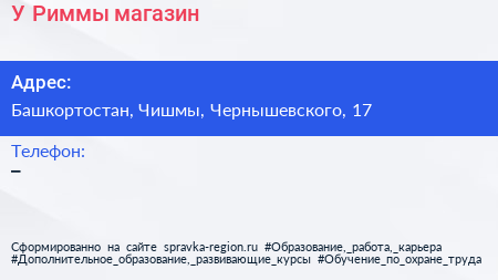 У Риммы, магазин по адресу Башкортостан, Чишмы, Чернышевского, 17 в дальнейшем Организация, размещена в следующих категориях: