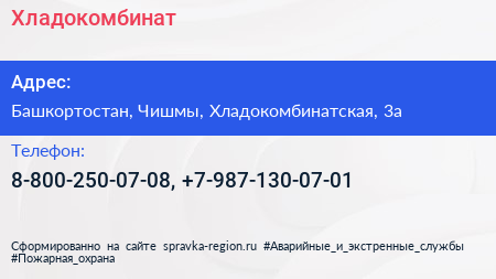 Хладокомбинат по адресу Башкортостан, Чишмы, Хладокомбинатская, 3а в дальнейшем Организация, размещена в следующих категориях: