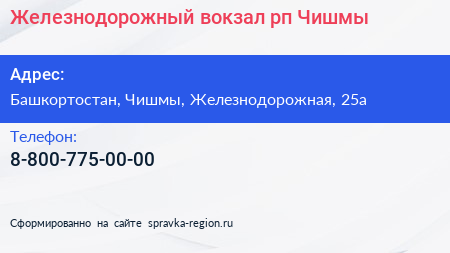 Железнодорожный вокзал, рп. Чишмы по адресу Башкортостан, Чишмы, Железнодорожная, 25а в дальнейшем Организация, размещена в следующих категориях: