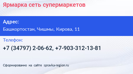Ярмарка, сеть супермаркетов по адресу Башкортостан, Чишмы, Кирова, 11 в дальнейшем Организация, размещена в следующих категориях: