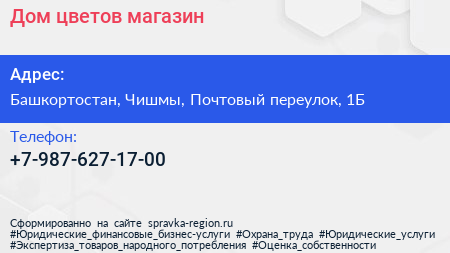Дом цветов, магазин по адресу Башкортостан, Чишмы, Почтовый переулок, 1Б в дальнейшем Организация, размещена в следующих категориях: