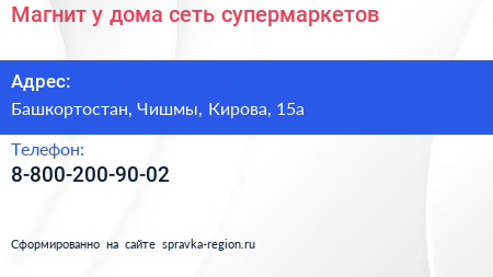 Магнит у дома, сеть супермаркетов по адресу Башкортостан, Чишмы, Кирова, 15а в дальнейшем Организация, размещена в следующих категориях: