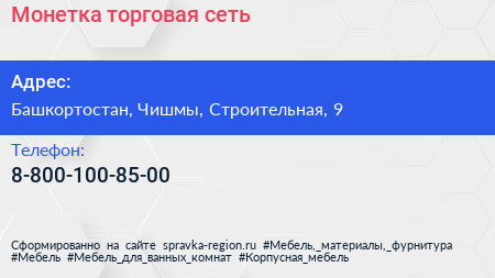 Монетка, торговая сеть по адресу Башкортостан, Чишмы, Строительная, 9 в дальнейшем Организация, размещена в следующих категориях: