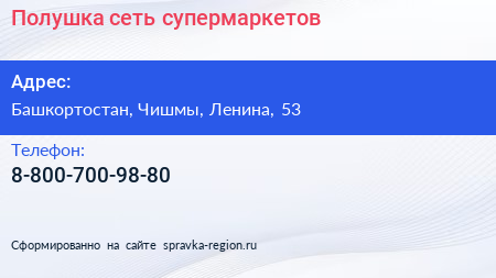 Полушка, сеть супермаркетов по адресу Башкортостан, Чишмы, Ленина, 53 в дальнейшем Организация, размещена в следующих категориях:
