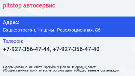 pitstop, автосервис по адресу Башкортостан, Чишмы, Революционная, 86 в дальнейшем Организация, размещена в следующих категориях:
