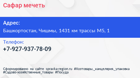 Сафар, мечеть по адресу Башкортостан, Чишмы, 1431 км трассы М5, 1 в дальнейшем Организация, размещена в следующих категориях: