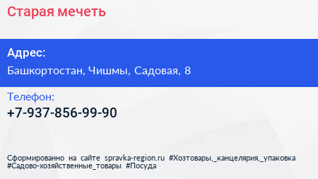 Старая мечеть по адресу Башкортостан, Чишмы, Садовая, 8 в дальнейшем Организация, размещена в следующих категориях: