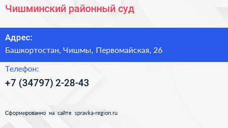 Чишминский районный суд по адресу Башкортостан, Чишмы, Первомайская, 26 в дальнейшем Организация, размещена в следующих категориях: