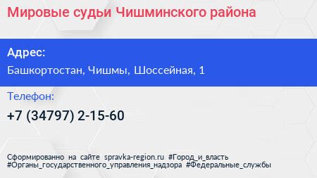Мировые судьи Чишминского района по адресу Башкортостан, Чишмы, Шоссейная, 1 в дальнейшем Организация, размещена в следующих категориях: