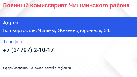 Военный комиссариат Чишминского района по адресу Башкортостан, Чишмы, Железнодорожная, 34а в дальнейшем Организация, размещена в следующих категориях:
