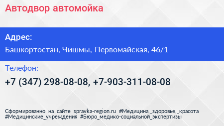 Автодвор, автомойка по адресу Башкортостан, Чишмы, Первомайская, 46/1 в дальнейшем Организация, размещена в следующих категориях: