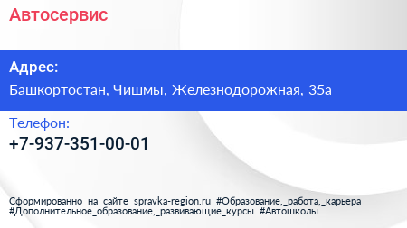 Автосервис по адресу Башкортостан, Чишмы, Железнодорожная, 35а в дальнейшем Организация, размещена в следующих категориях: