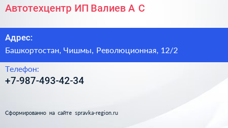Автотехцентр, ИП Валиев А.С. по адресу Башкортостан, Чишмы, Революционная, 12/2 в дальнейшем Организация, размещена в следующих категориях: