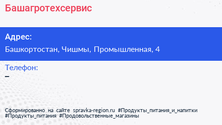 Башагротехсервис по адресу Башкортостан, Чишмы, Промышленная, 4 в дальнейшем Организация, размещена в следующих категориях: