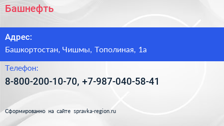 Башнефть по адресу Башкортостан, Чишмы, Тополиная, 1а в дальнейшем Организация, размещена в следующих категориях: