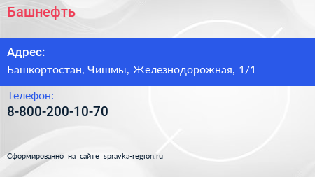 Башнефть по адресу Башкортостан, Чишмы, Железнодорожная, 1/1 в дальнейшем Организация, размещена в следующих категориях: