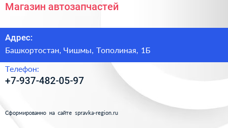 Магазин автозапчастей по адресу Башкортостан, Чишмы, Тополиная, 1Б в дальнейшем Организация, размещена в следующих категориях: