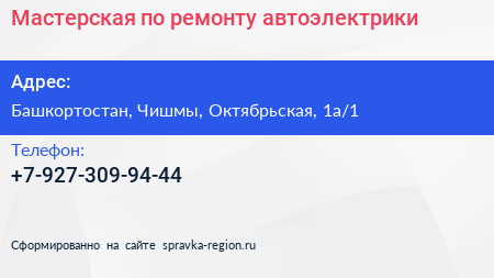 Мастерская по ремонту автоэлектрики по адресу Башкортостан, Чишмы, Октябрьская, 1а/1 в дальнейшем Организация, размещена в следующих категориях: