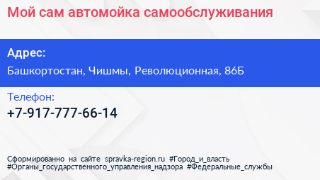 Мой сам, автомойка самообслуживания по адресу Башкортостан, Чишмы, Революционная, 86Б в дальнейшем Организация, размещена в следующих категориях: