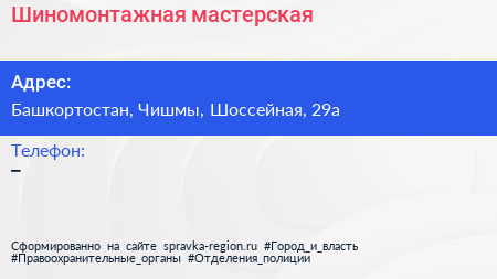 Шиномонтажная мастерская по адресу Башкортостан, Чишмы, Шоссейная, 29а в дальнейшем Организация, размещена в следующих категориях: