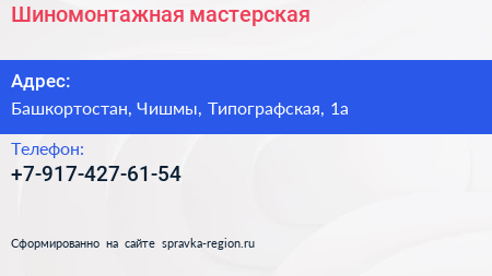 Шиномонтажная мастерская по адресу Башкортостан, Чишмы, Типографская, 1а в дальнейшем Организация, размещена в следующих категориях: