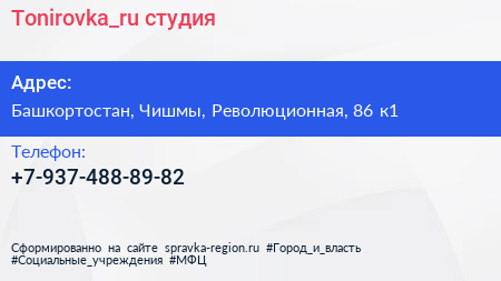 Tonirovka_ru, студия по адресу Башкортостан, Чишмы, Революционная, 86 к1 в дальнейшем Организация, размещена в следующих категориях: