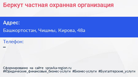 Беркут, частная охранная организация по адресу Башкортостан, Чишмы, Кирова, 48а в дальнейшем Организация, размещена в следующих категориях: