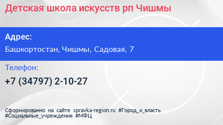 Детская школа искусств, рп. Чишмы по адресу Башкортостан, Чишмы, Садовая, 7 в дальнейшем Организация, размещена в следующих категориях: