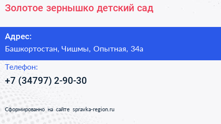 Золотое зернышко, детский сад по адресу Башкортостан, Чишмы, Опытная, 34а в дальнейшем Организация, размещена в следующих категориях: