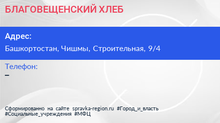 БЛАГОВЕЩЕНСКИЙ ХЛЕБ по адресу Башкортостан, Чишмы, Строительная, 9/4 в дальнейшем Организация, размещена в следующих категориях:
