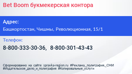Bet Boom, букмекерская контора по адресу Башкортостан, Чишмы, Революционная, 15/1 в дальнейшем Организация, размещена в следующих категориях: