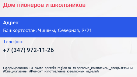 Дом пионеров и школьников по адресу Башкортостан, Чишмы, Северная, 9/21 в дальнейшем Организация, размещена в следующих категориях: