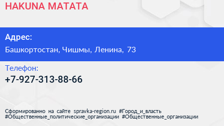 HAKUNA MATATA по адресу Башкортостан, Чишмы, Ленина, 73 в дальнейшем Организация, размещена в следующих категориях: