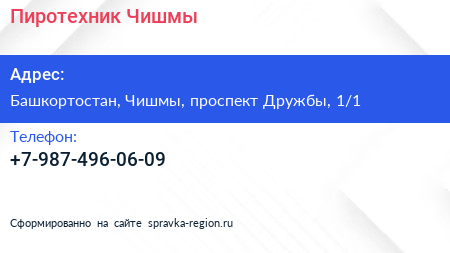 Пиротехник Чишмы по адресу Башкортостан, Чишмы, проспект Дружбы, 1/1 в дальнейшем Организация, размещена в следующих категориях:
