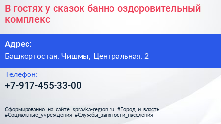 В гостях у сказок, банно-оздоровительный комплекс по адресу Башкортостан, Чишмы, Центральная, 2 в дальнейшем Организация, размещена в следующих категориях: