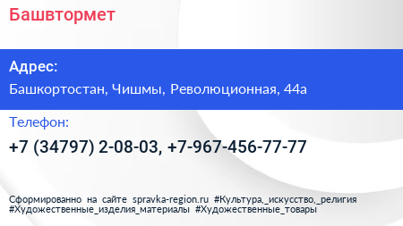 Башвтормет по адресу Башкортостан, Чишмы, Революционная, 44а в дальнейшем Организация, размещена в следующих категориях: