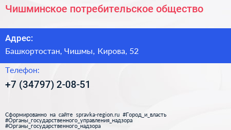 Чишминское потребительское общество по адресу Башкортостан, Чишмы, Кирова, 52 в дальнейшем Организация, размещена в следующих категориях: