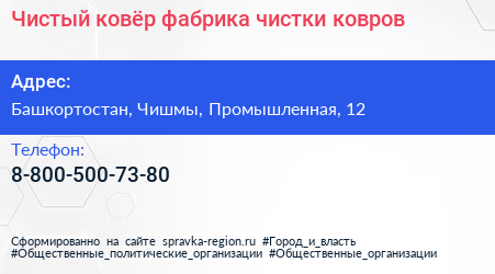 Чистый ковёр, фабрика чистки ковров по адресу Башкортостан, Чишмы, Промышленная, 12 в дальнейшем Организация, размещена в следующих категориях: