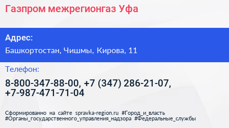 Газпром межрегионгаз Уфа по адресу Башкортостан, Чишмы, Кирова, 11 в дальнейшем Организация, размещена в следующих категориях: