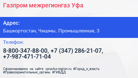 Газпром межрегионгаз Уфа по адресу Башкортостан, Чишмы, Промышленная, 3 в дальнейшем Организация, размещена в следующих категориях: