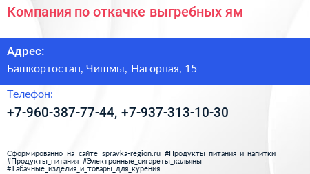 Компания по откачке выгребных ям по адресу Башкортостан, Чишмы, Нагорная, 15 в дальнейшем Организация, размещена в следующих категориях: