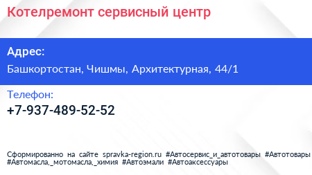 Котелремонт, сервисный центр по адресу Башкортостан, Чишмы, Архитектурная, 44/1 в дальнейшем Организация, размещена в следующих категориях: