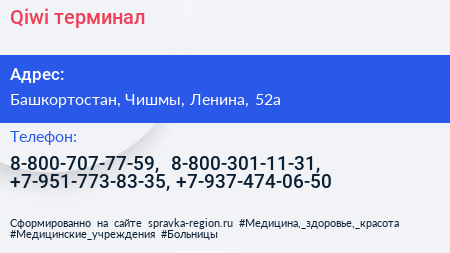 Qiwi, терминал по адресу Башкортостан, Чишмы, Ленина, 52а в дальнейшем Организация, размещена в следующих категориях: