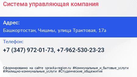 Система, управляющая компания по адресу Башкортостан, Чишмы, улица Трактовая, 17а в дальнейшем Организация, размещена в следующих категориях: