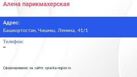 Алена, парикмахерская по адресу Башкортостан, Чишмы, Ленина, 41/1 в дальнейшем Организация, размещена в следующих категориях:
