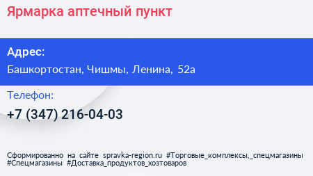 Ярмарка, аптечный пункт по адресу Башкортостан, Чишмы, Ленина, 52а в дальнейшем Организация, размещена в следующих категориях: