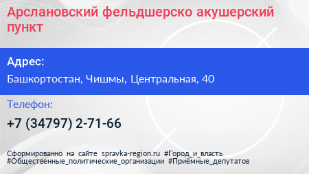 Арслановский фельдшерско-акушерский пункт по адресу Башкортостан, Чишмы, Центральная, 40 в дальнейшем Организация, размещена в следующих категориях: